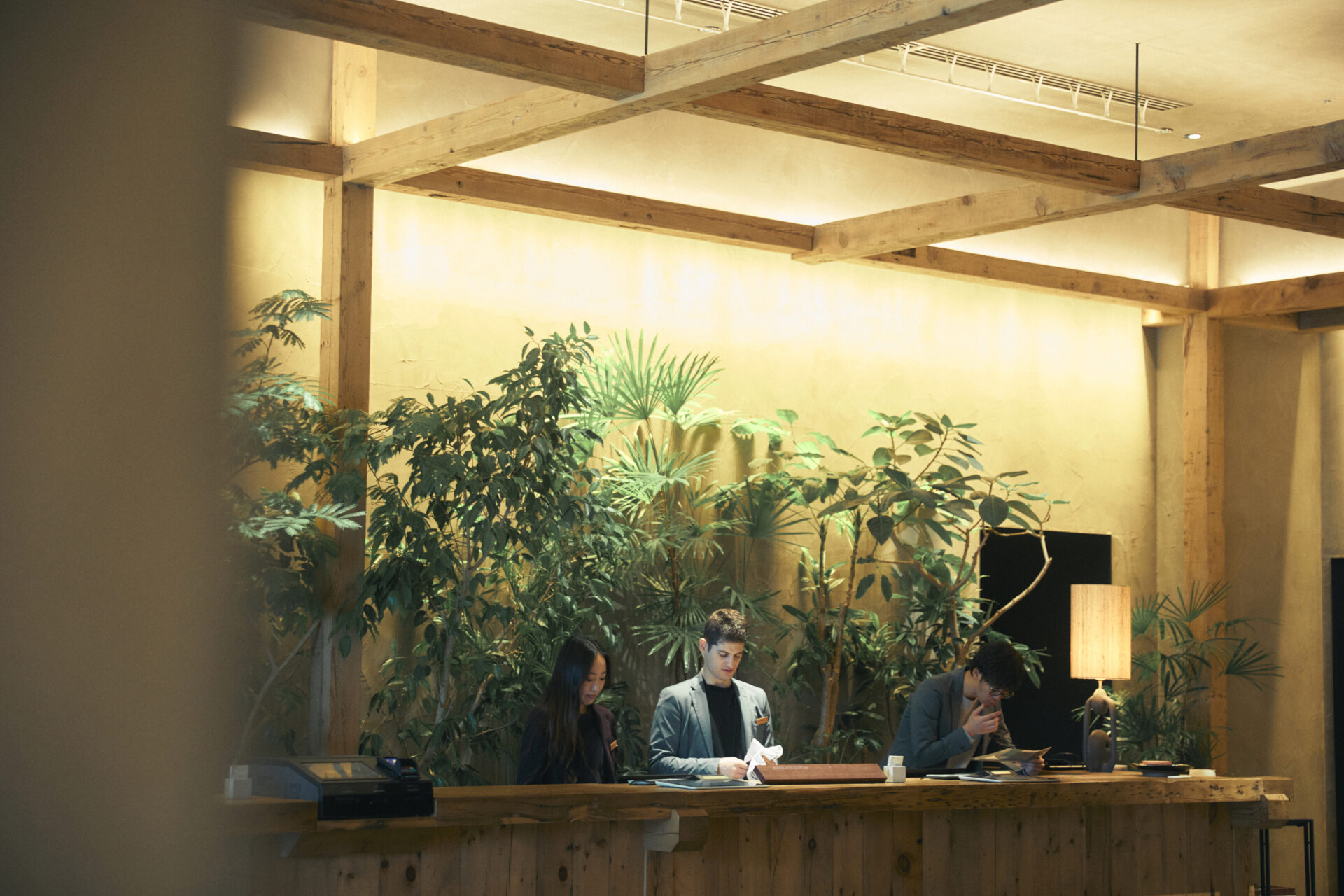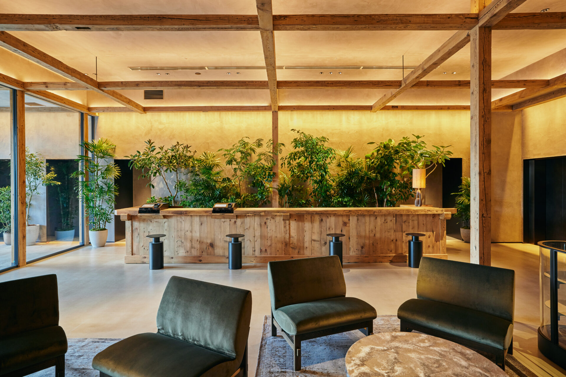 ロビーはお茶屋の数寄屋造りを思わせるしつらえで、壁を設けず開放的な空間をつくり、旅人と地域の人が自然に混ざり合う“場”として機能しています。