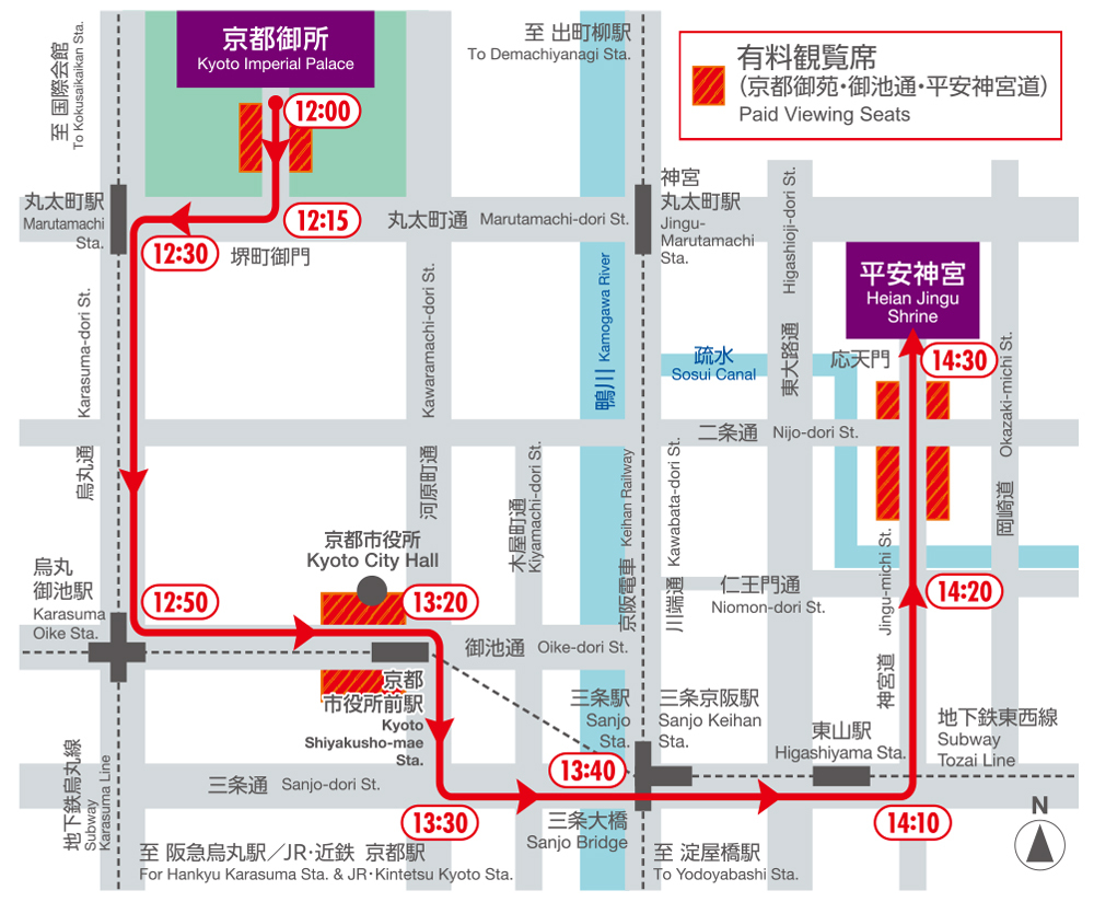 The procession departs from the Kyoto Imperial Palace's Kenreimon Gate at noon, and parades along Kyoto's main roads, from Marutamachi-dori to Karasuma-dori to Oike-dori to Sanjo-dori, passing through Jingu-michi and finally arriving at Heian Shrine, taking approximately two and a half hours.